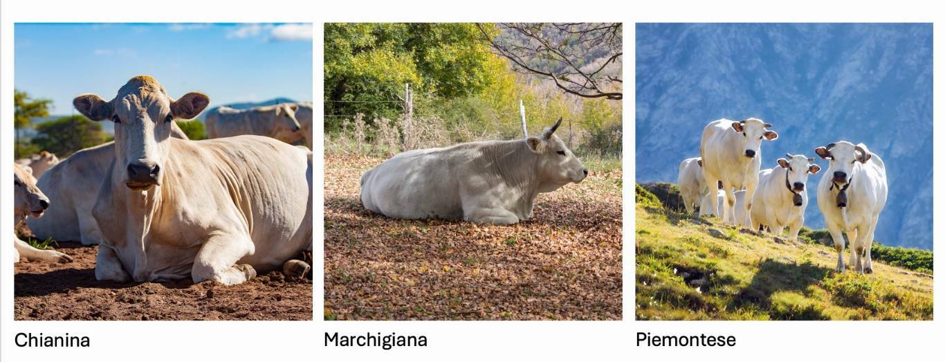 Tra le principali razze bovine tipicamente italiane troviamo la gigantesca Chianina, la Marchigiana dalla testa possente e la Piemontese (Fassona), che è una delle più antiche al mondo. Queste sono razze che attualmente vengono allevate soprattutto per la produzione di carne. Ci sono poi le razze a duplice attitudine come la Pezzata Rossa, la Pezzata Nera Valdostana, la Bruna Alpina e la Grigio Alpina. Come dicevamo prima, vengono allevate sia per la produzione di latte che di carne. Esistono poi razze autoctone, di una certa importanza, come la Maremmana, la Romagnola e la Podolica, quest'ultima diffusa principalmente nel Centro-Sud Italia. E non possiamo infine menzionare altre razze autoctone, meno diffuse, come la Sardo Modicana, la Calvana, la Garfagnina e la Pontremolese.
