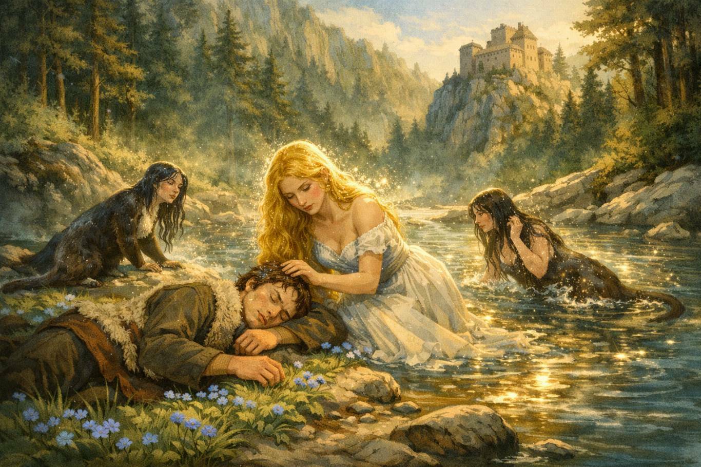 In passato, tre belle ragazze venivano in Primiero ogni estate per vendere fiori, e nessuno in valle aveva mai visto quel tipo di fiori. Erano tutte e tre molto belle, ma erano anche silenziose e tra loro si capivano con piccoli cenni della testa. Alcuni dicevano che non erano esseri umani, altri pensavano che erano probabilmente Guane, altri invece che vivevano nei fiumi. Un giovane pastore della valle, che si chiamava Siror, si innamorò follemente di una di loro, quella che aveva capelli lunghi color oro. La seguiva ovunque, di villaggio in villaggio, trascurando spesso le sue pecore e intervenendo ogni qual volta qualcuno la infastidiva. Un giorno Siror volle scoprire dove vivevano le tre fanciulle. Giunta la sera, le seguì in modo da non essere visto, finché le fanciulle si fermarono sulla riva del fiume Cismon. Si tuffarono nell'acqua, nuotarono per un po' e infine si trasformarono in lontre. Il povero Siror si spaventò a tal punto che crollò a terra svenuto. Le tre lontre nuotarono fino a riva, uscirono dall'acqua e, tramutatesi nuovamente in fanciulle, corsero vicino al pastore. La ragazza coi capelli d'oro accarezzò il ragazzo privo di sensi e lo baciò. Perché mi hai seguito fin qui? -sussurrò piangendo. Ora il nostro segreto è svelato e dovremo vivere per sempre come lontre. Ma io vorrei tanto vederti ancora... Ti ricorderai di me? Le altre due Guane riportarono in acqua la fanciulla, dove si trasformarono ancora una volta in lontre e scomparvero. Quando la mattina dopo Siror si svegliò, all'inizio pensò che fosse stato un sogno: le Guane, le lontre, la ragazza coi capelli d'oro... Rimase in piedi sospirando e stava per tornare a casa quando vide che il prato dove aveva dormito era tutto coperto di fiorellini blu, dello stesso tipo di quelli che vendevano le Guane. D’improvviso sentì uno sciabordio, si girò e là, al centro del fiume, vide una linea di schiuma dorata, e gli parve di sentire una voce che diceva: - Non dimenticarmi... non dimenticarmi!